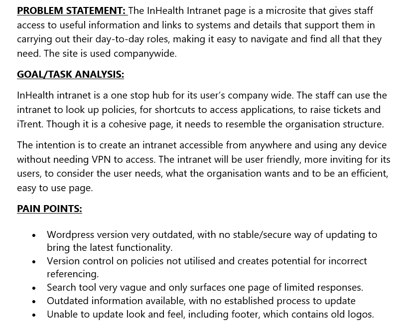 The intranet is used companywide and was dated, with no stable or secure way to update functionality and containing old information with incorrect policy referencing.