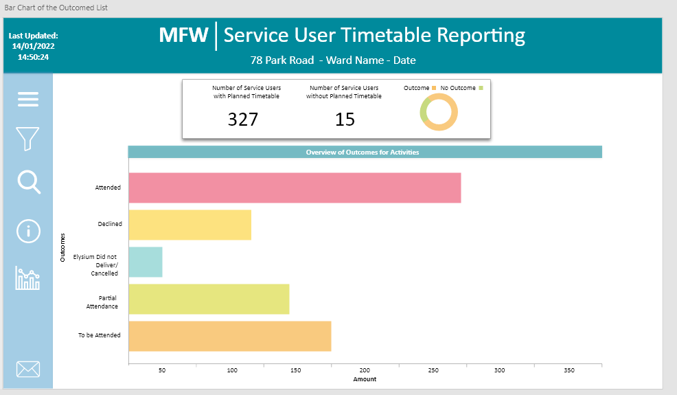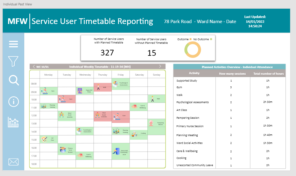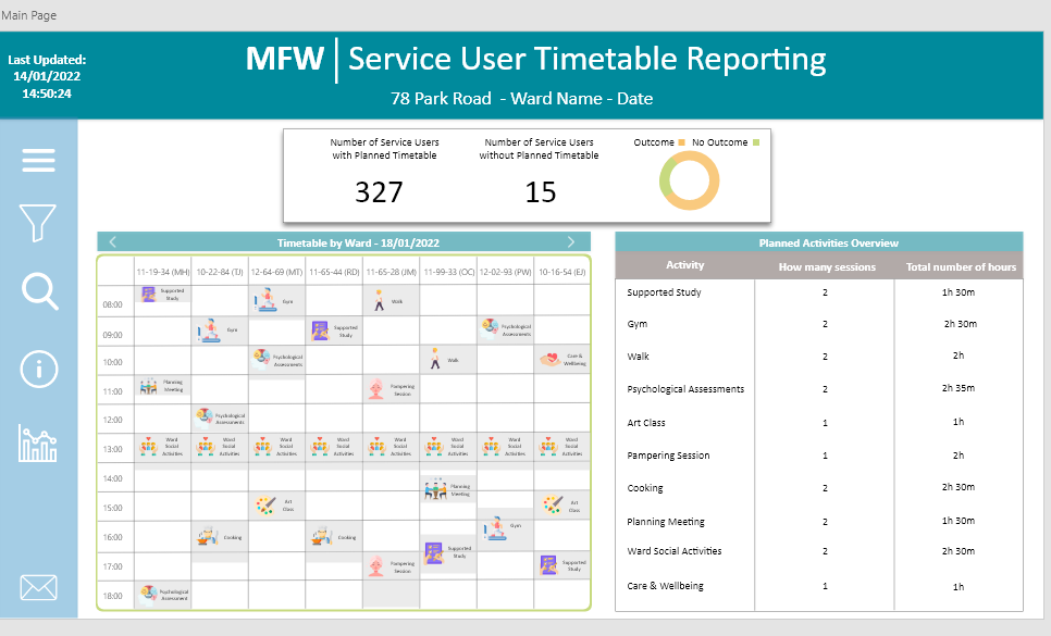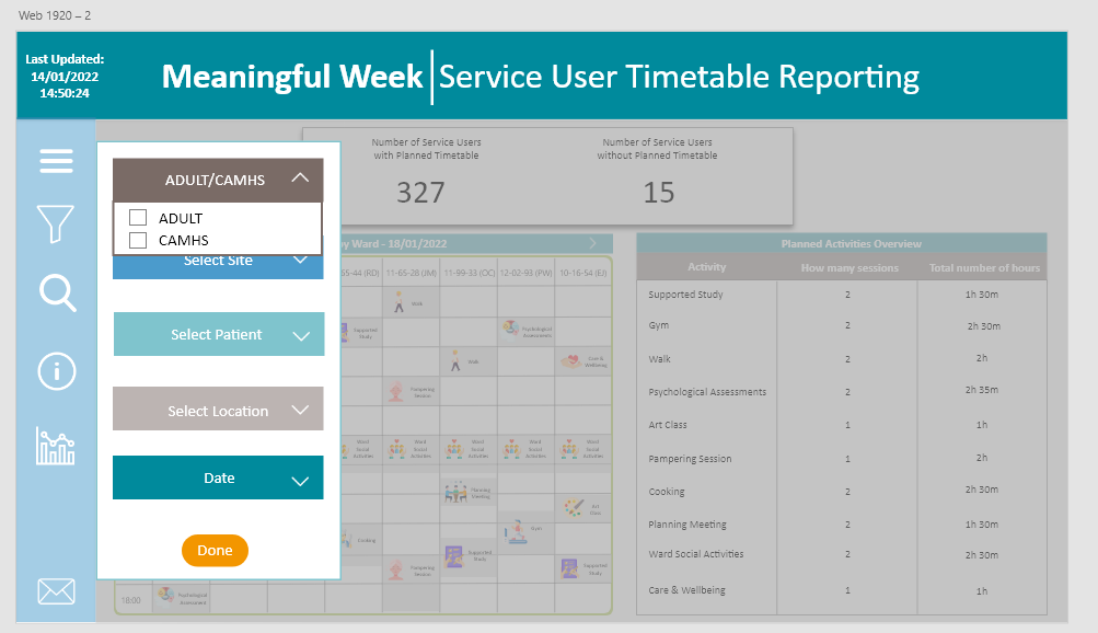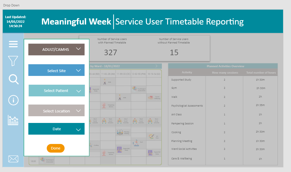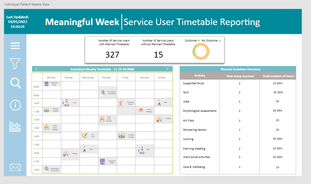 The reports show a ward activity timetable with a dashboard overview of figures, which the user could delve into for more detailed data.