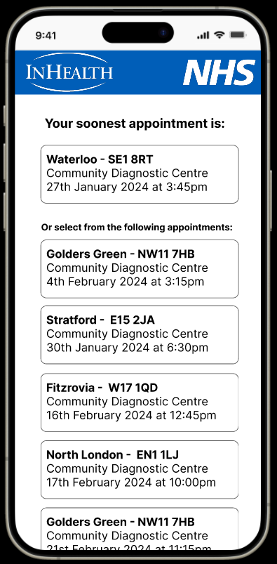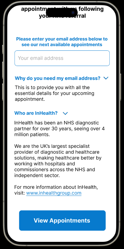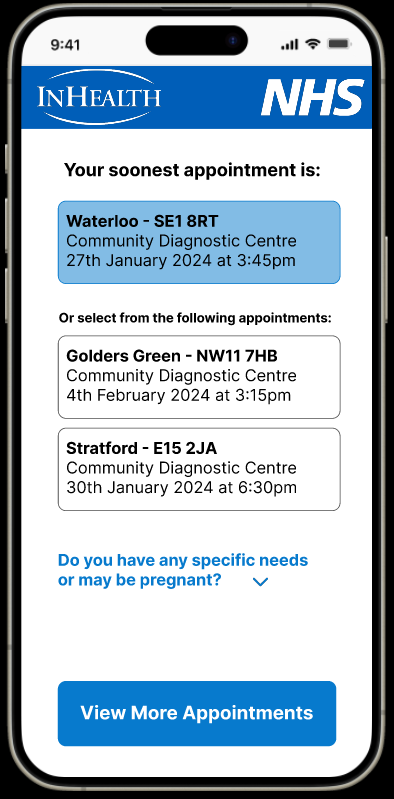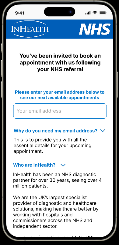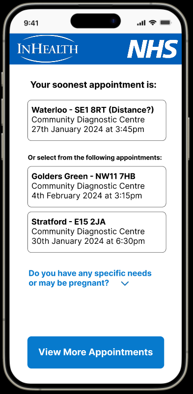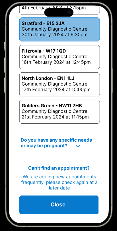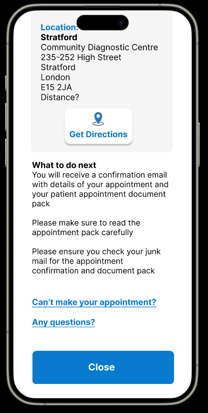 Product owners wanted the option to speak to an advisor removed to minimise calls to the Patient Referral Centre and keep the booking process completely digital, in the hands of the patient.